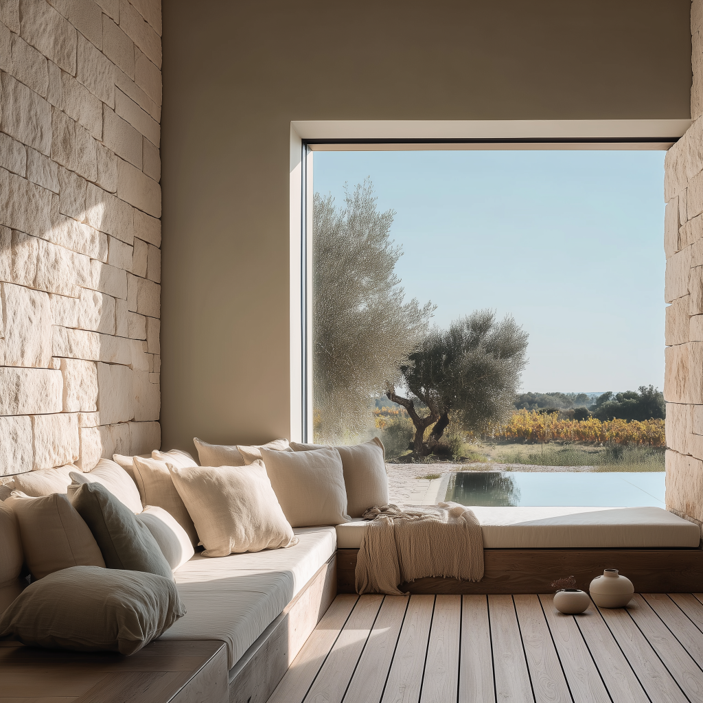 Its clean, natural shades enter into dialogue with the rough texture of exposed stone, creating a unique visual and tactile balance: a harmonious contrast that adds warmth without weight.